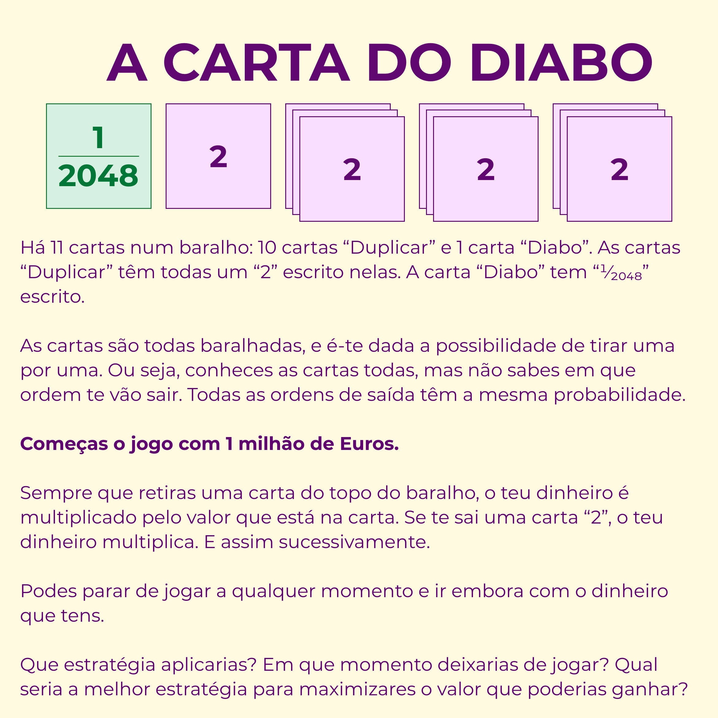 Se te sair a carta “Diabo” na primeira jogada, que fazes? Continuas? E se te saísse na segunda jogada? Partindo daqui, consegues minimamente delinear todas as jogadas possíveis, a sua probabilidade, e risco/retorno que tens com cada nova jogada. Tendo isso em conta, como procederias?